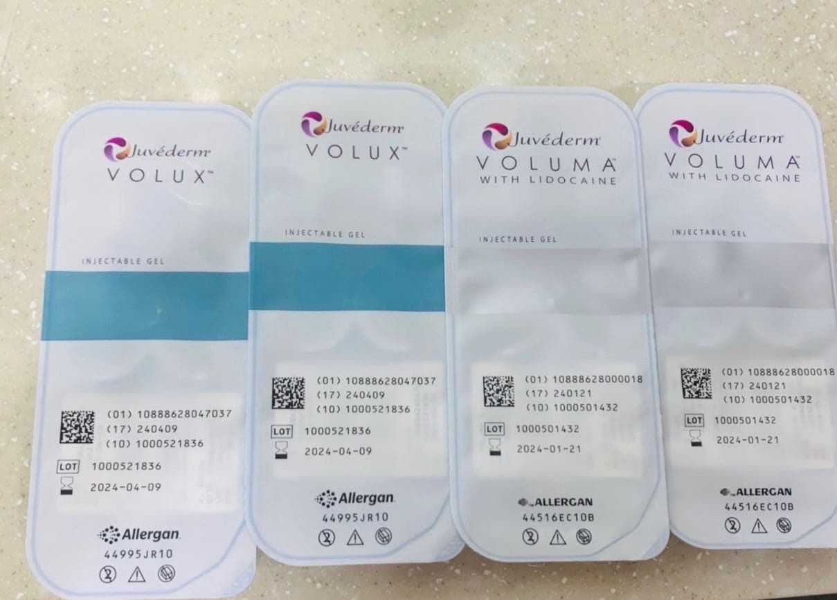 醫師說因為我的下巴真的整體偏短還有點後縮 所有建議劑量一次打好打滿,然後選擇的劑型是喬雅登的VOLUX,醫師說這是專門針對下巴及下顎線條的劑型,由於這個劑型打起來會比較偏俐落感,我是希望線條偏柔和 所以為了增加柔和度、又增加了Voluma劑型,增加飽滿度跟柔和度一字排開好壯觀啊!