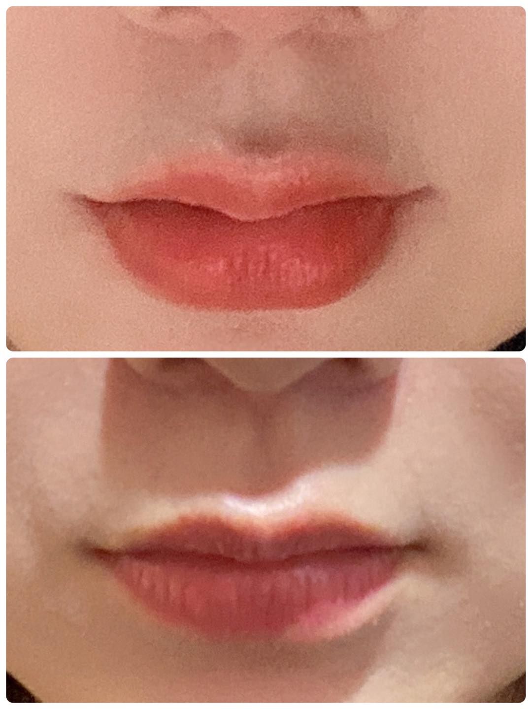 有圖有真相,你們自己看比較圖吧!兩張都是素唇,上面是打完一個月後,下面是打的當天拍的,除了唇形變好看外,唇紋也淡很淡多耶!乾癟的嘴唇真的好顯老呀!