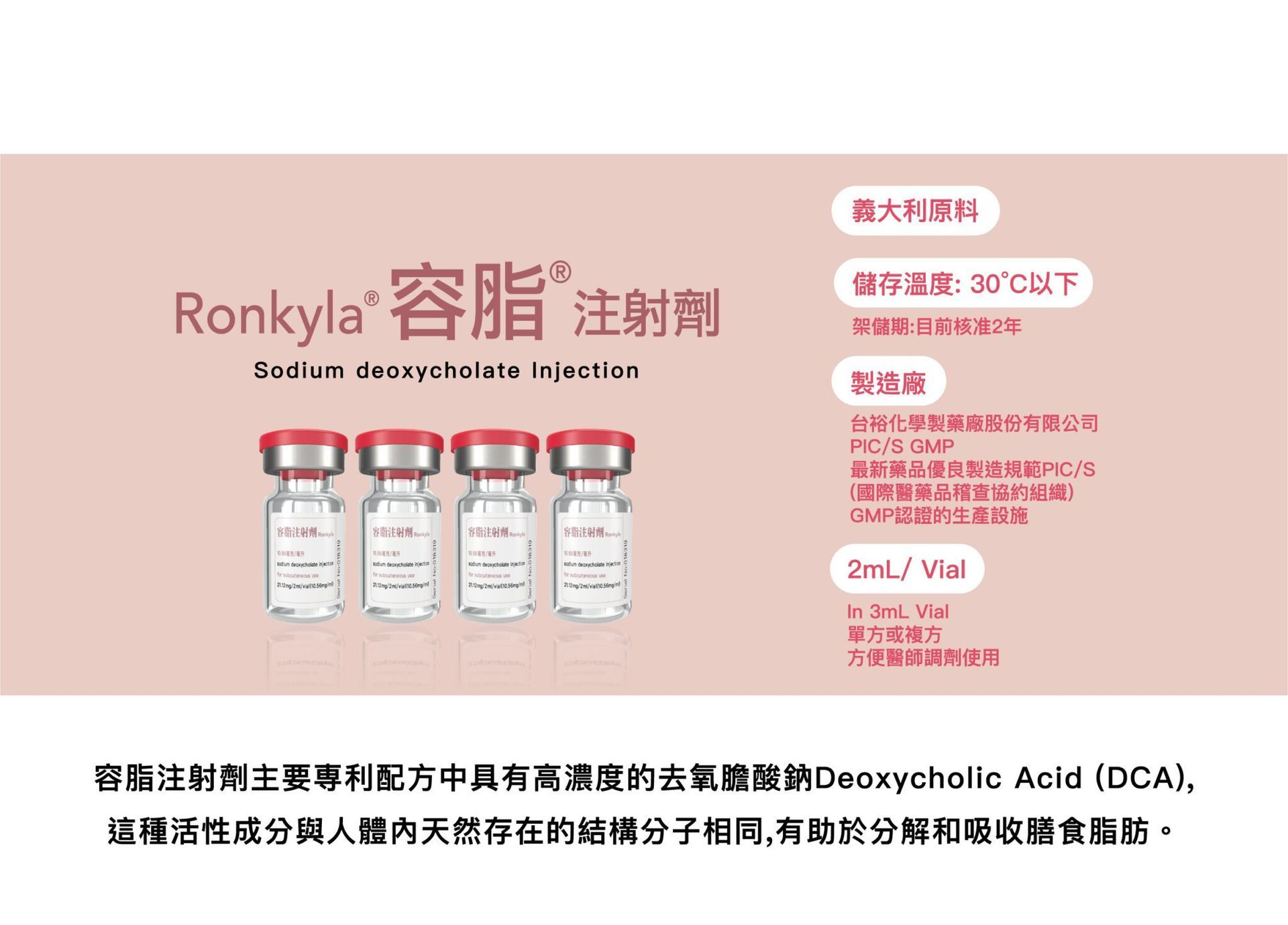 Ronkyla 容脂消脂針獨特的專利配方中,主要含有高濃度活性成分:去氧膽酸。